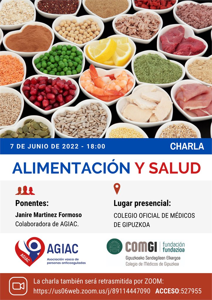 La Asociación Vasca de Personas Anticoaguladas (AGIAC), en colaboración con la Fundación del Colegio de médicos de Gipuzkoa, va a llevar a cabo la charla Alimentación y salud el próximo martes 7 de junio, a las 18:00h.