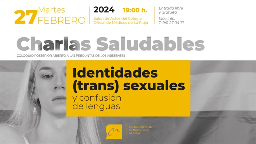 El Colegio Oficial de Médicos de La Rioja organiza dentro del marco Charlas Saludables, “Identidades trans(sexuales) y confusión de lenguas”. Será el martes día 27 de febrero a las 19:00 horas y será impartida por el Dr. Arturo Ezquerro Adán, Médico Especialista en Psiquiatría, Psicoterapeuta y Grupo Analista.