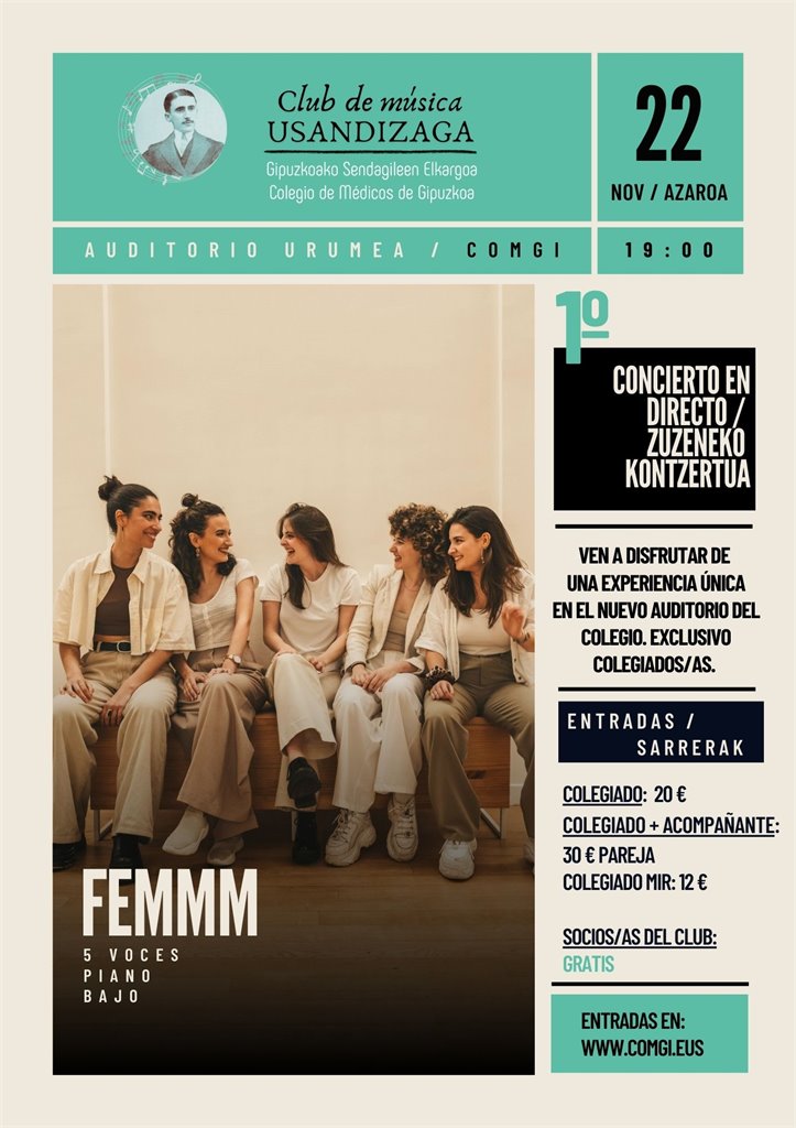 El próximo día 22 de noviembre, viernes, tendrá lugar el primero de ellos, de la mano del grupo FEMMM: 5 voces, piano y bajo.