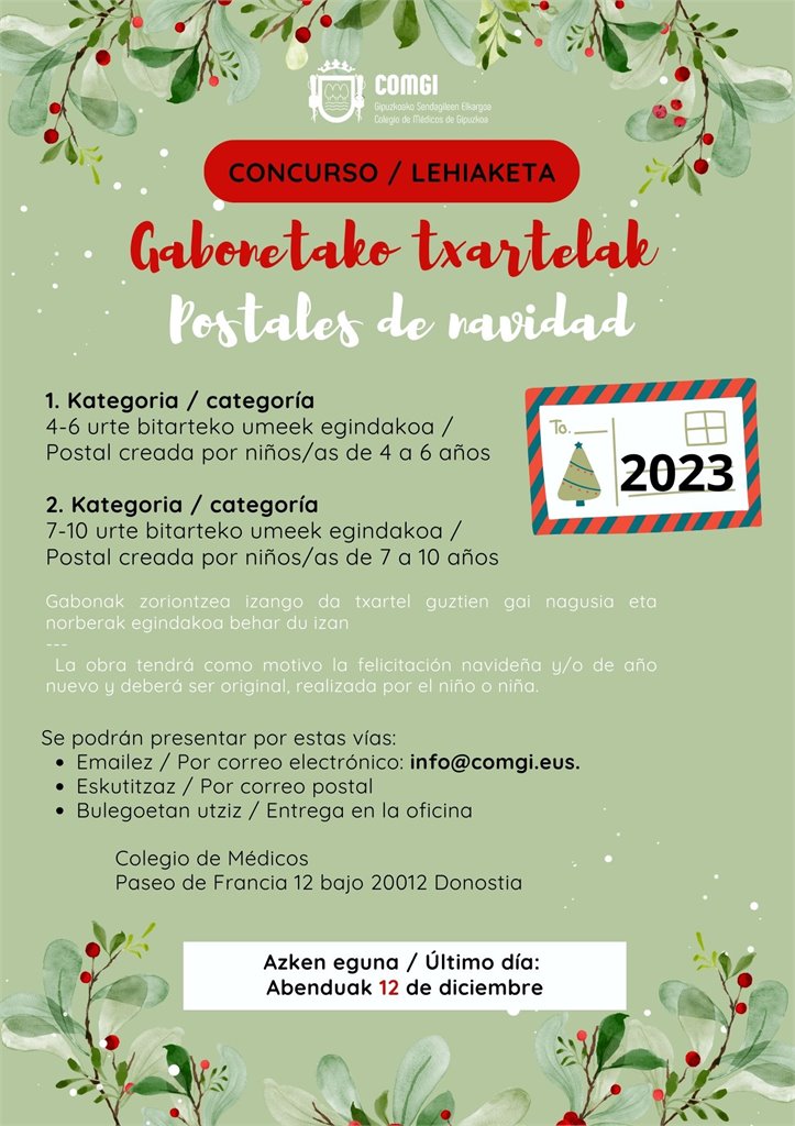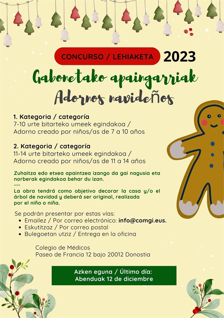 Un año más, el Colegio de Médicos de Gipuzkoa convoca una nueva edición de los concursos infantiles de navidad: el concurso a la mejor postal navideña y el concurso al mejor adorno navideño. Ambos están dirigidos a niños y niñas que sean hijos/as o nietos/as de colegiados.