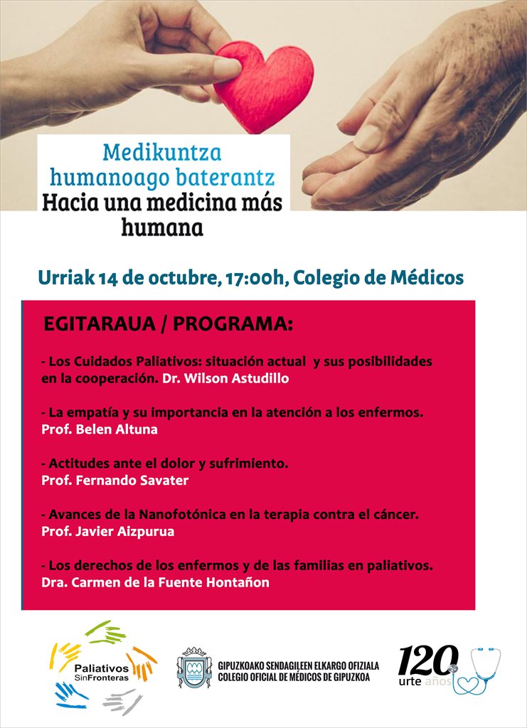 Dentro del 120 aniversario del Colegio y enmarcado en la campaña "Hacia una medicina más humana", el Colegio acogerá en 14 de octubre, por la tarde, el Día de los Cuidados Paliativos, con distintas ponencias sobre los cuidados paliativos y su situación actual, la importancia de la empatía, las actitudes ante el dolor y sufrimiento, los avances de la Nanofotónica o los derechos de los enfermos.