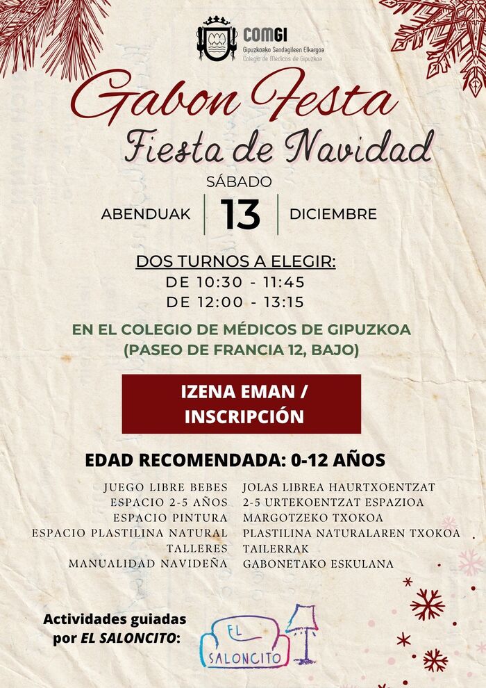 Será el próximo 13 de diciembre, sábado, en las salas polivalentes del Colegio donde los pequeños podrán disfrutar de distintas actividades y talleres, todas ellas guiadas por EL SALONCITO de Donostia.