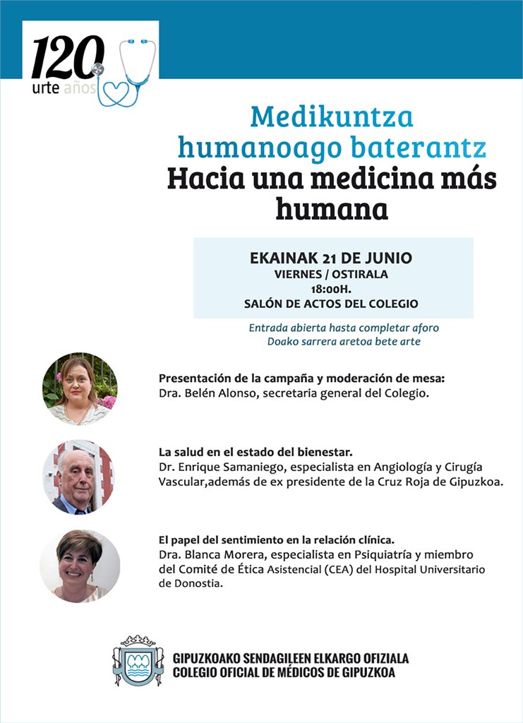Miembros de la Junta del Colegio presentarán la campaña "Hacia una medicina más humana" desarrollada por el Colegio con motivo del 120 aniversario del Colegio de Médicos de Gipuzkoa. La campaña tiene como objetivo reivindicar la importancia de la relación del médico y el paciente, una relación que debe ser “constante, cercana y de total confianza” y avanzar hacia una medicina más humana.