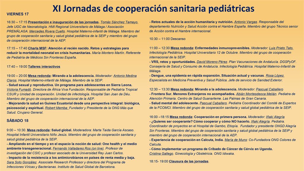 El Grupo de Cooperación sanitaria y Salud global pediátrica de la SEIP (Sociedad Española de Infectología Pediátrica) y Grupo de Cooperación Internacional de la AEP (Asociación Española de Pediatría) organizan para el próximo 17 y 18 de noviembre de 2023, el XI Jornadas de cooperación sanitaria pediátricas en Málaga.