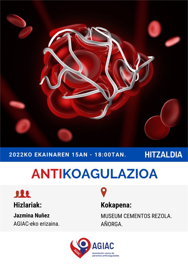 Asociación vasca de personas anticoaguladas (AGIAC) elkarteak Antikoagulazioa hitzaldia egingo du datorren asteartean, ekainaren 15ean, 18:00etan.