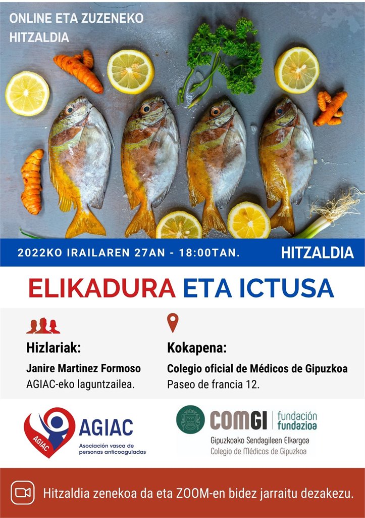 Asociación vasca de personas anticoaguladas (AGIAC) elkarteak, Gipuzkoako Medikuen Elkargoaren Fundazioarekin lankidetzan, Elikadura eta iktusa hitzaldia egingo du datorren asteartean, irailaren 27an, 18:00etan.