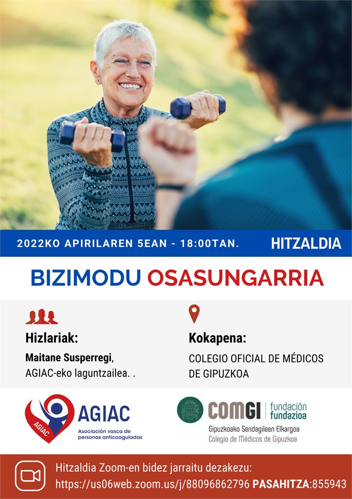 Asociación vasca de personas anticoaguladas (AGIAC) elkarteak, Gipuzkoako Medikuen Elkargoaren Fundazioarekin lankidetzan, OSASUN-BIZITZA ESTILOA hitzaldia egingo du datorren asteartean, apirilaren 5ean, 18:00etan.