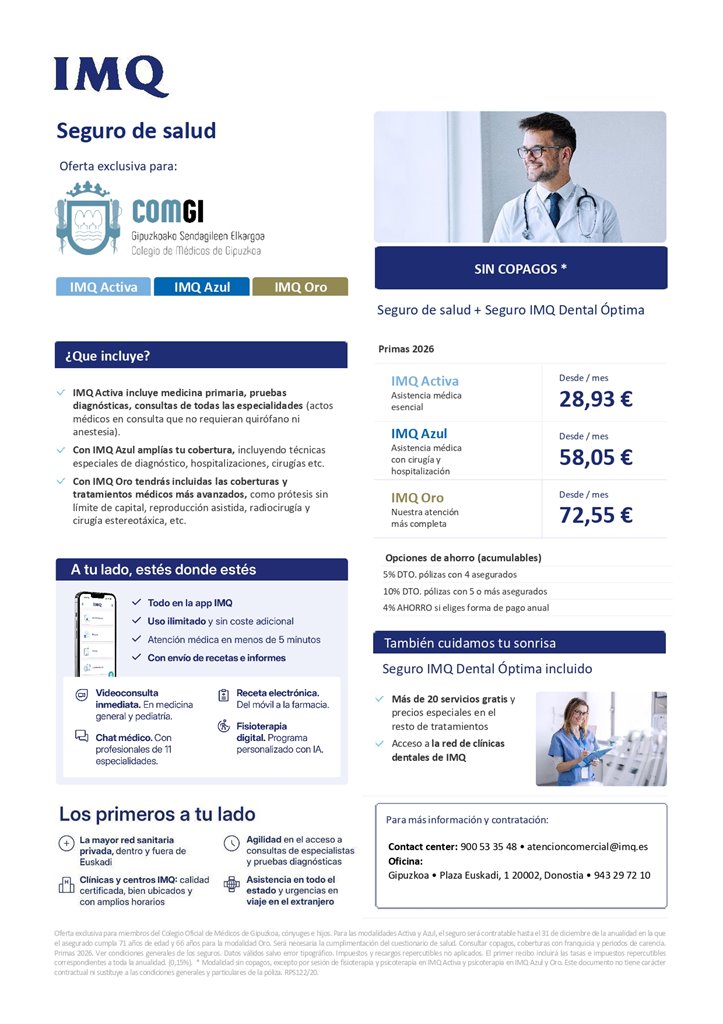 Gipuzkoako Medikuen Elkargoaren eta IMQren (Euskadiko osasun-aseguratzaile nagusia) arteko hitzarmenari esker, elkargokideek baldintza esklusiboak izango dituzte IMQren mediku-aseguruetan: