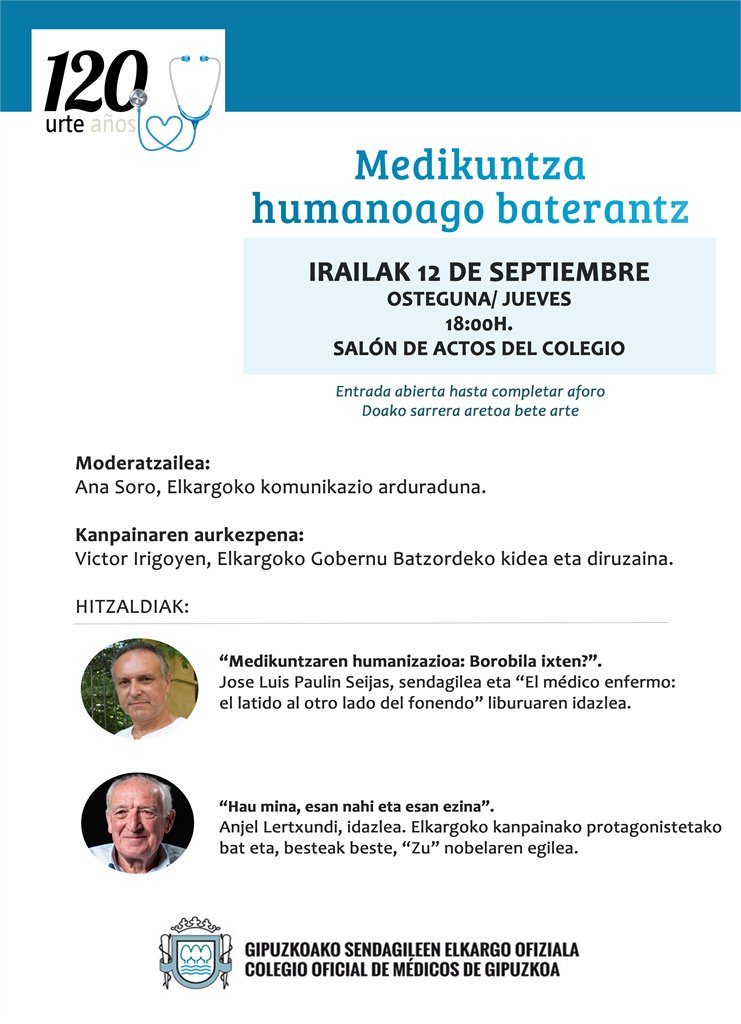 Elkargoaren 120. urteurrenaren baitan, "Medikuntza humanoago baterantz" leloa duen kanpaina jarri du martxan Elkargoak. Ekainean gaian sakontzeko lehen mahai ingurua egin zen, gaztelaniaz, eta orain irailean bigarrena egingo da, euskaraz. Honetan, gainera, kanpainan parte hartu duen Anjel Lertxundi izango da gurekin, baita gure lankide den Jose Luis Paulin Seijas sendagilea. Sarrera irekia eta doakoa da aretoa bete arte.