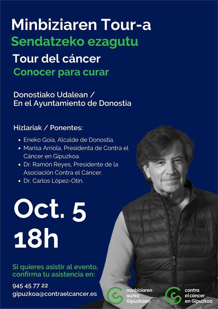 Ekitaldi honetan, Carlos López-Otin doktorearen hitzaldi magistrala entzuteko aukera izango dugu. Gainera, Eneko Goia Donostiako Alkatea, Ramon Reyes Minbiziaren Aurkako Elkarteko presidente nazionala eta Marisa Arriola Minbiziaren Aurka Gipuzkoan-eko presidentea izango dira bertan.