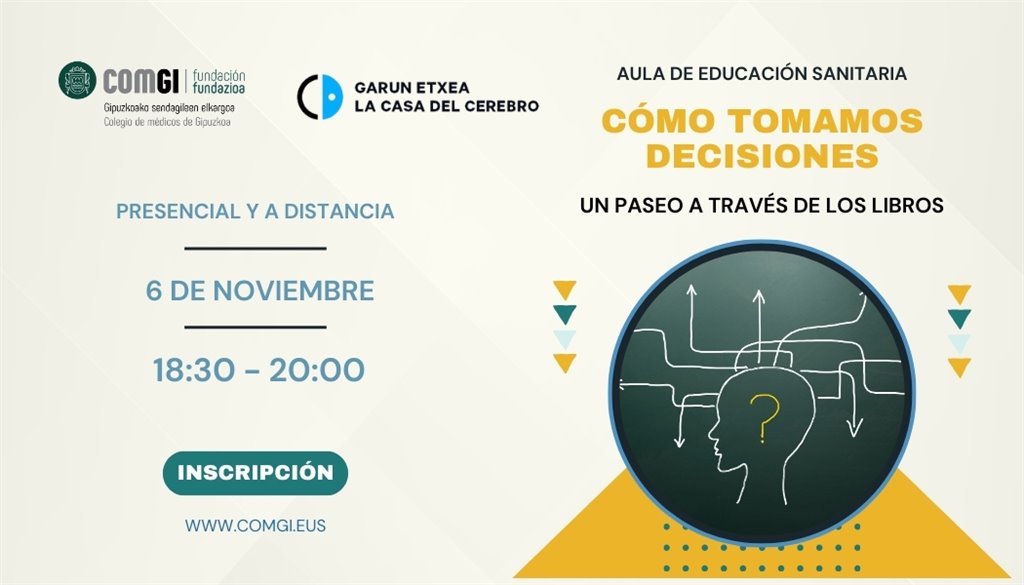 Garunaren Etxeak eta COMGI Fundazioak Nola hartzen ditugun erabakiak. Liburuetan zehar ibilaldia hitzaldia antolatu dute azaroaren 6an, 18:30ean. Gizarteari zuzendutako saio horiek COMGI Fundazioak hainbat elkarterekin elkarlanean antolatzen duen Osasun Hezkuntzako Gelan sartzen dira, eta osasuna sustatzea dute helburu, baita osasun-arloko ikerketa eta berrikuntza herritarrei hurbiltzea ere.