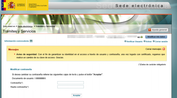 - Behin saioa hasita, pasahitz bat asmatu beharko duzu ondorengo mezua irteten bazaizu: “Aviso de seguridad: Con el fin de garantizar su identidad en el acceso a través de usuario y contraseña, una vez logado con certificado, rogamos que realice un cambio de su clave de acceso. Gracias”. Pasahitz horrek behintzat 6 hitz eta gehienez 18 izan beharko ditu.