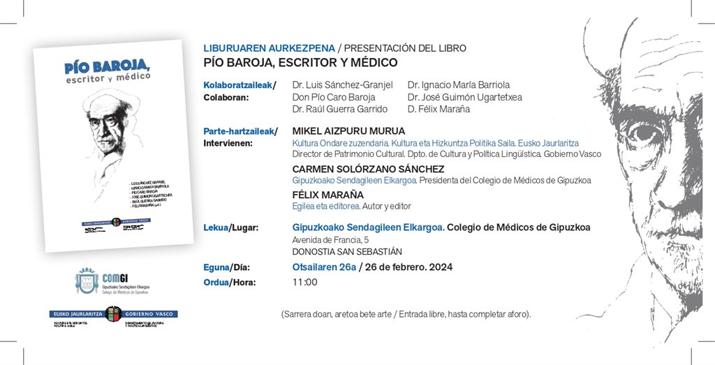 Datorren astelehenean, otsailak 26, goizeko 11:00etan, PIO BAROJA, ESCRITOR Y MÉDICO liburua aurkeztuko da Gipuzkoako Sendagileen Elkargoko Areto Nagusian.